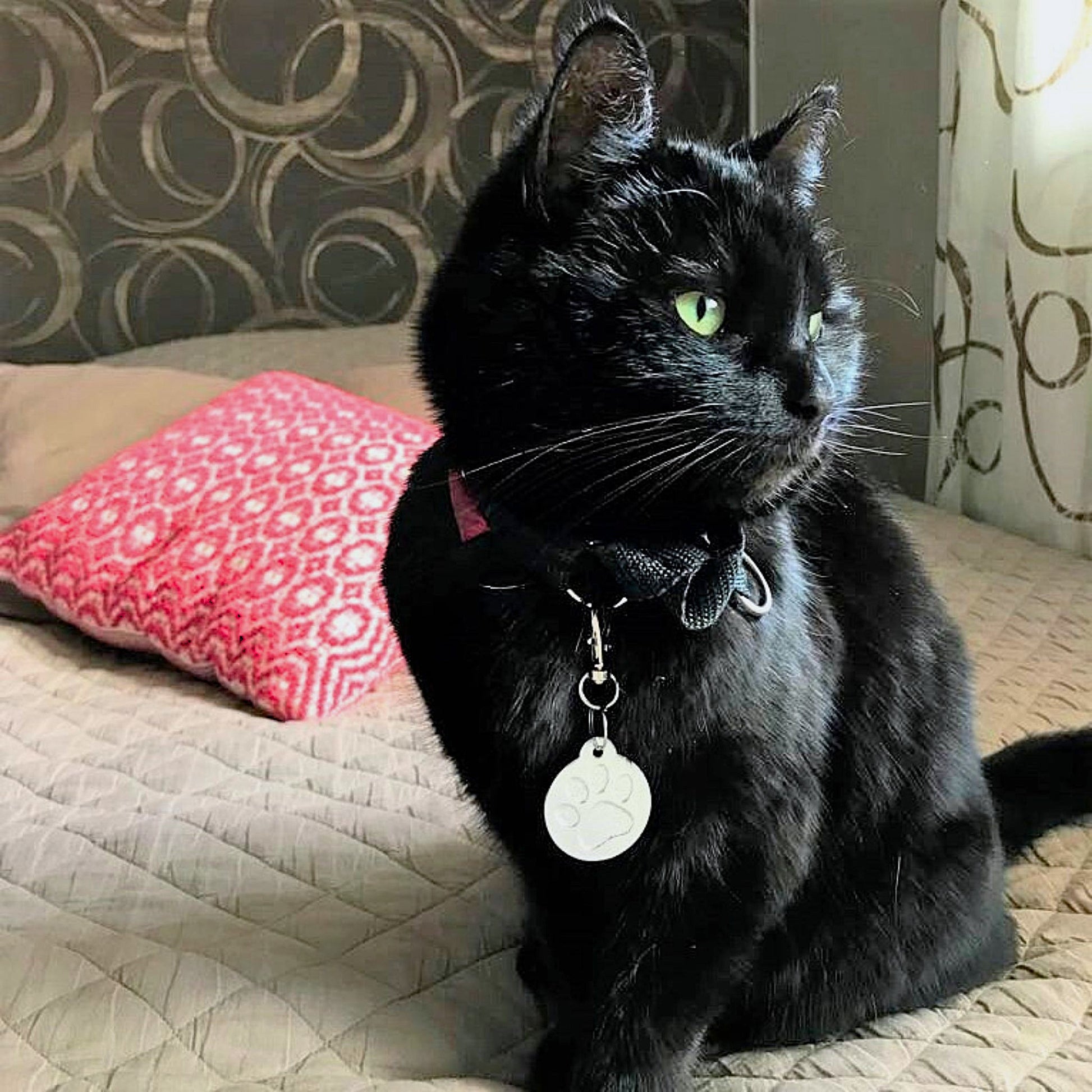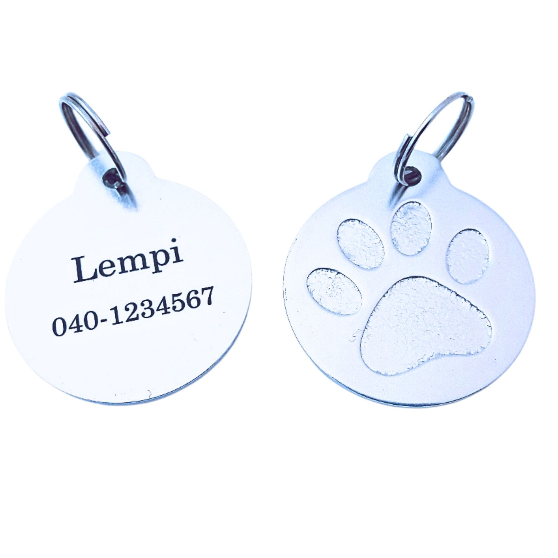 Nimilaatan etupuolella on tassukuvio ja toiselle puolelle nimilaattaan merkitään lemmikin nimi sekä omistajan puhelinnumero.