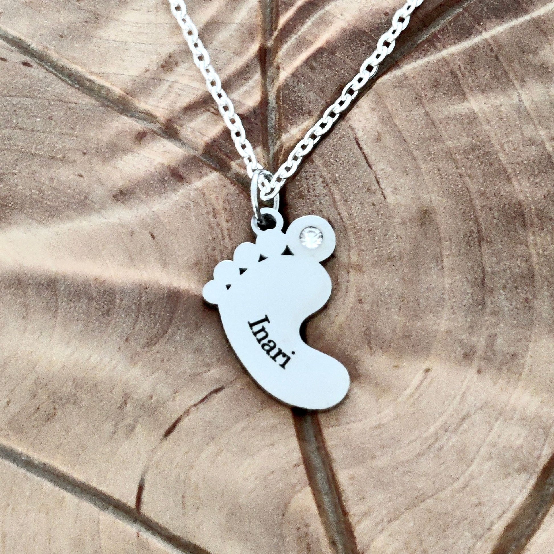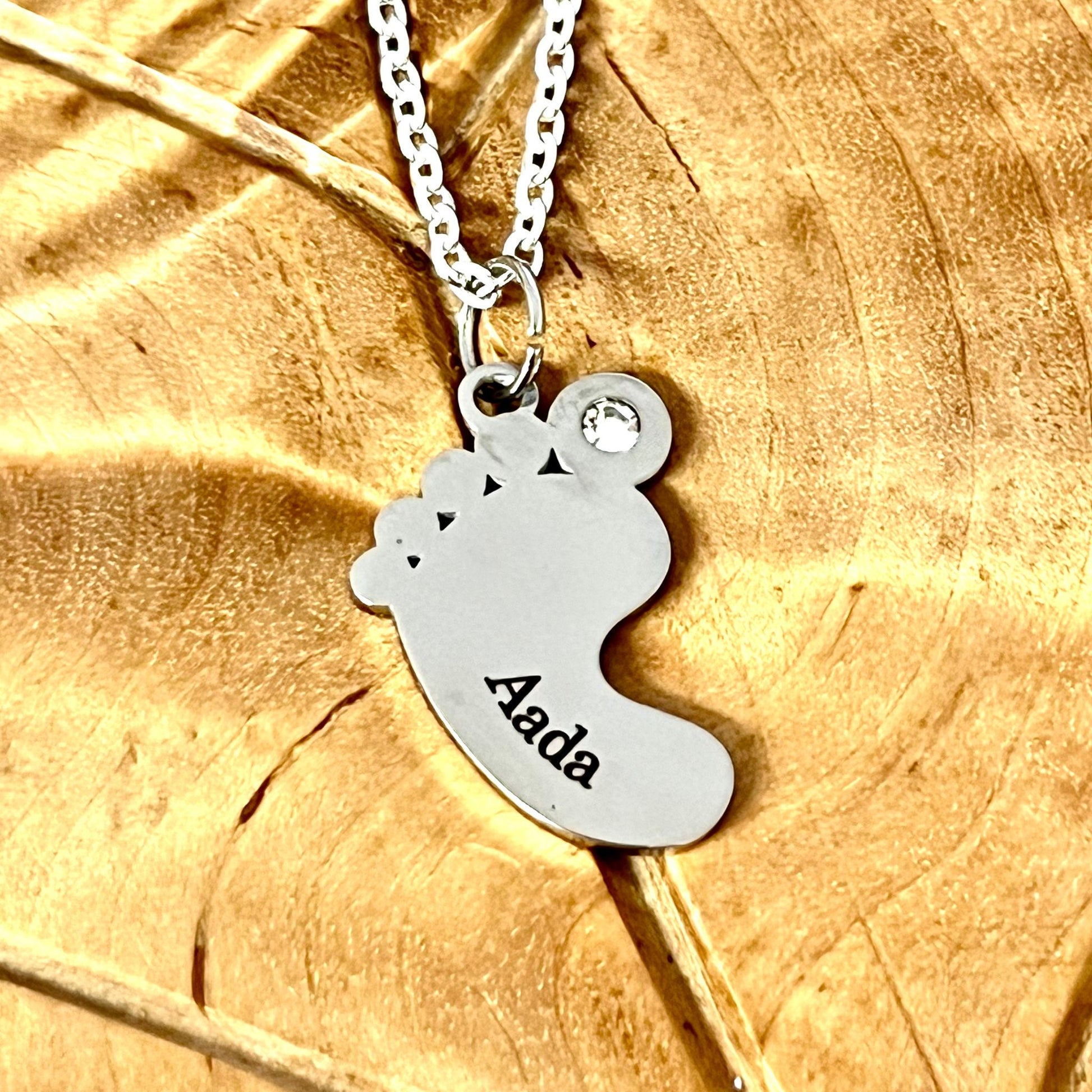 Vauvan varpaat nimikoru pienellä timantilla. Erityinen koru äidille. Koruun saa kaiverrettua lapsen nimen.